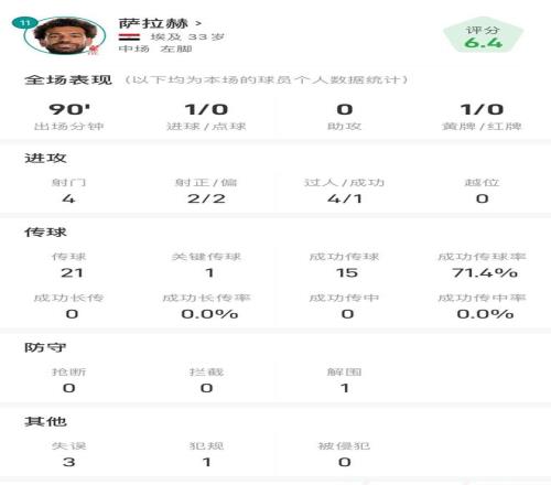 萨拉赫vs小蜜蜂数据:4射2正进1球,1关键传球,3失误