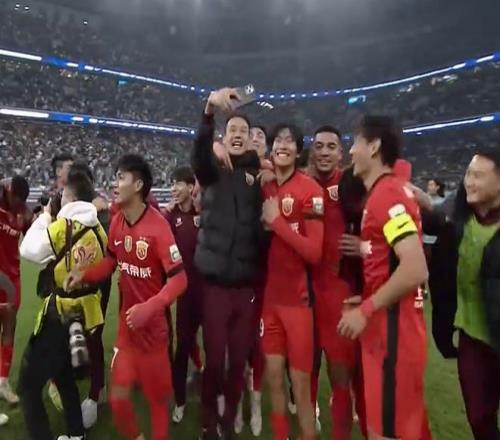 比赛结束之后,上海海港全队疯狂庆祝,球员狂奔狂欢、教练组击掌庆祝,甚至布里埃尔跪地庆祝夺冠,就连伤缺的武磊眼眶湿润,随后围在一块跳舞庆祝,现场的海港球迷也是陷入了沸腾。