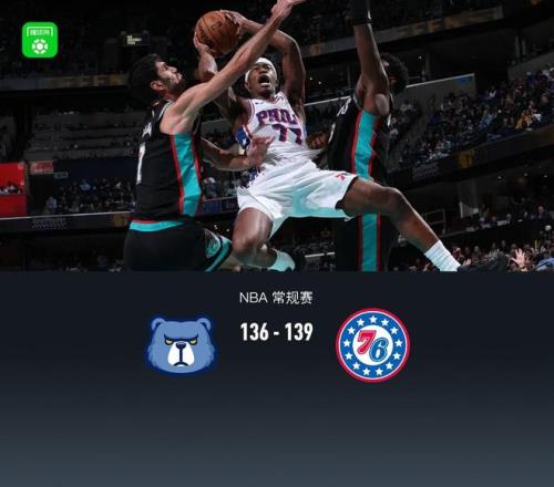 第一节,开场76人多点开花三分不断,取得17-7开局,随后76人命中率下滑,灰熊马克西领衔一波14-4迫近比分,后半节灰熊延续势头阿尔达马连续中远拉开分差,76人马克西、乔治、格莱姆斯回应,但节末灰熊斯莫尔、斯宾塞得分再度拉开分差,首节结束,灰熊40-34领先76人。 第二节,开节段76人乔治、恩比德站出来联手反超比分,灰熊科沃德持续冲框回应,紧跟节中阿尔达马连续三分再度拉开分差至6分,节末段马克西、恩比德联手追分,随着马克西三分再中追平比分,半场战罢,双方72平。 第三节,上来灰熊考沃德、莫兰特持续联手得分将分差拉大至8分,随后76人马克西、巴洛站出来得分缩小分差,紧跟乔治、埃奇库姆得分再度追平,节末段继续依靠马克西、恩比德取得领先,三节结束,76人103-100灰熊。 第四节,开节76人格莱姆斯、恩比德相继三分领先至7分,随后灰熊莫兰特站出来突破连得11分追上比分,后半节上来76人埃奇库姆连续三记三分再度拉开至7分,灰熊莫兰特站出来持续冲框再度追平,最后阶段双方三分连续不中,双方128平进加时。 加时赛,上来灰熊连续反击迅速领先4分,随后76人乔治、恩比德站出来反超比分,灰熊还是莫兰特站出来冲框追平比分,最后时刻76人埃奇库姆三分准绝杀,最后1.7秒灰熊考沃德三分不中,最终灰熊136-139不敌76人。